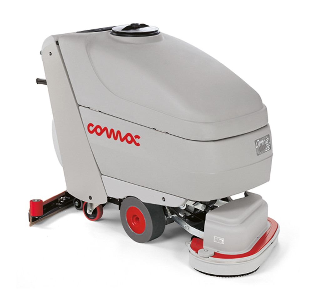 Udvalget af Omnia gulvvaskemaskiner består af to modeller med automatisk trækkraft, som man betjener ved at gå bagved under anvendelse af maskinen.